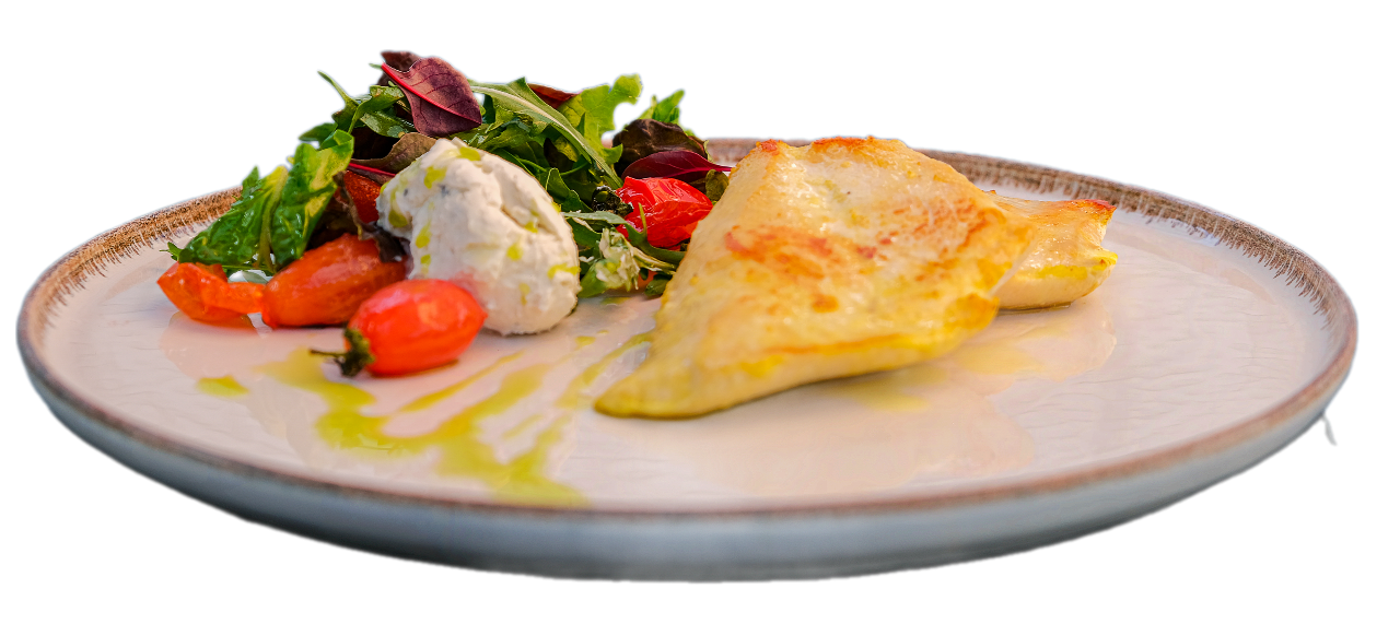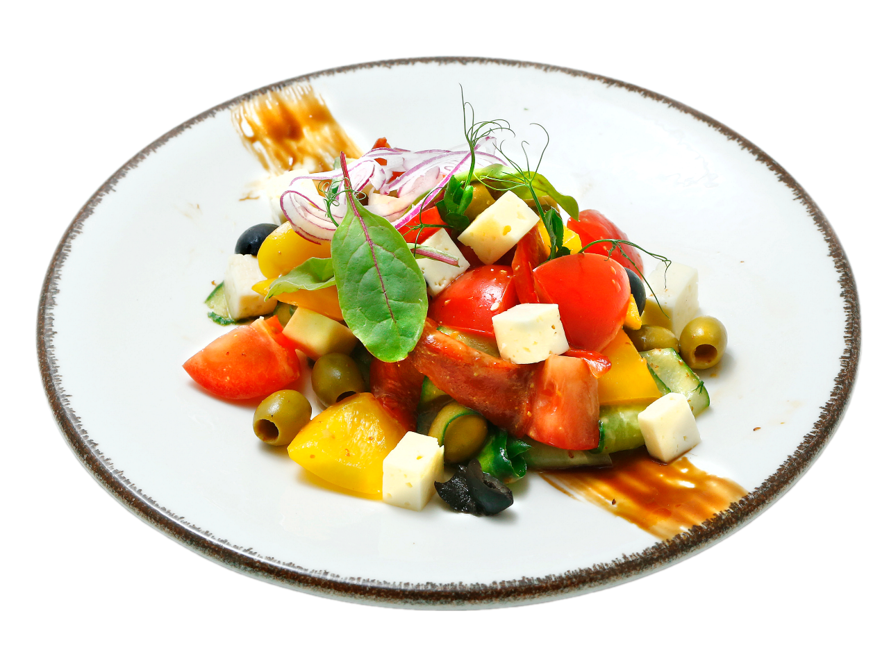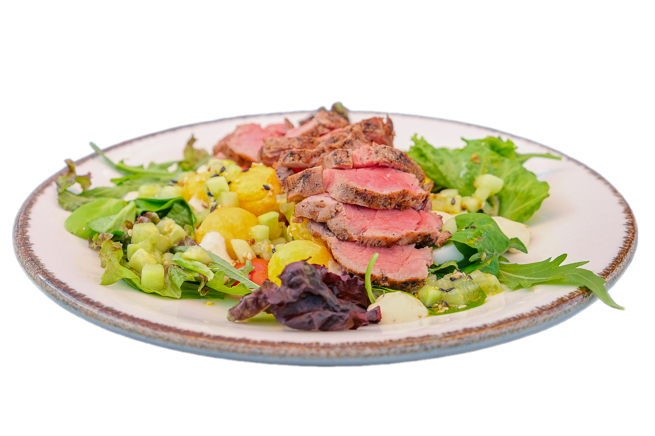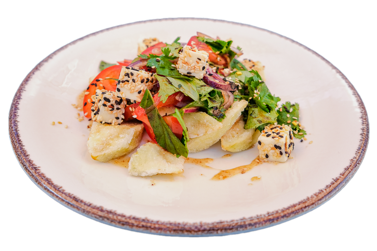 Запечённая свёкла, нежный творожный сыр, микс салатных листьев и кедровые орешки под медово-бальзамическим дрессингом.