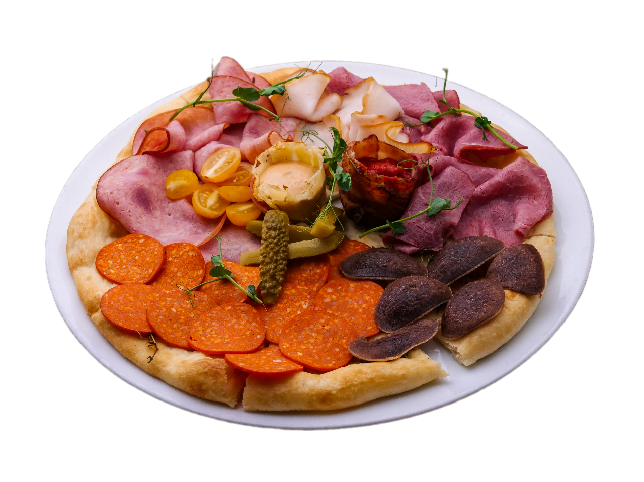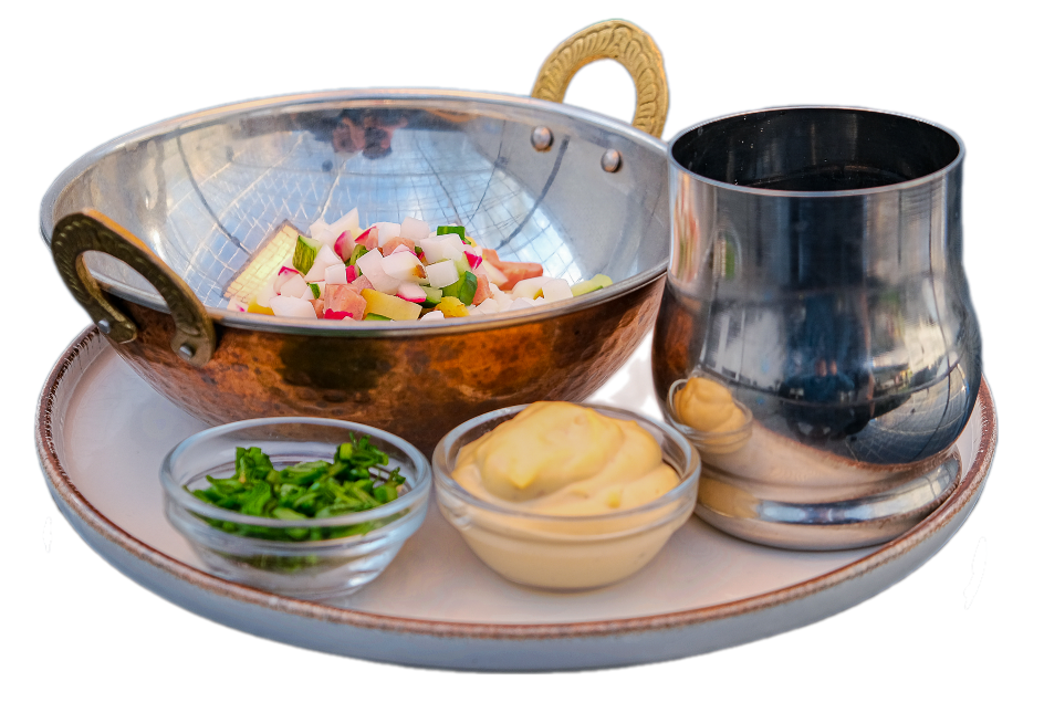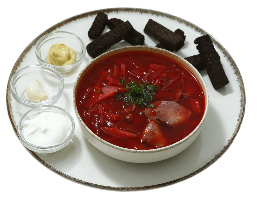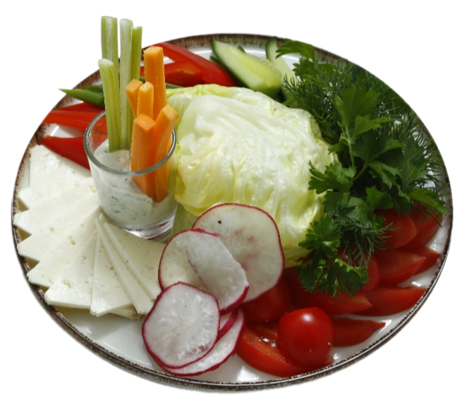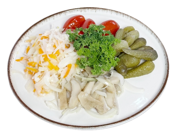 Селедка, картофель запеченый, хлеб бородинский, лук репчатый, корнишоны, зелень, сливочное масло.